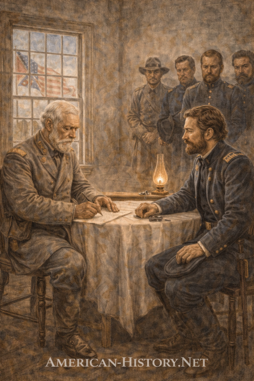 By this time, the Confederate army was running low on important supplies and Confederate soldiers had starting deserting. So on April 9, 1865, General Robert E. Lee and General Ulysses S. Grant met at a house in Appomattox, Virginia. Here, General Lee agreed to surrender.