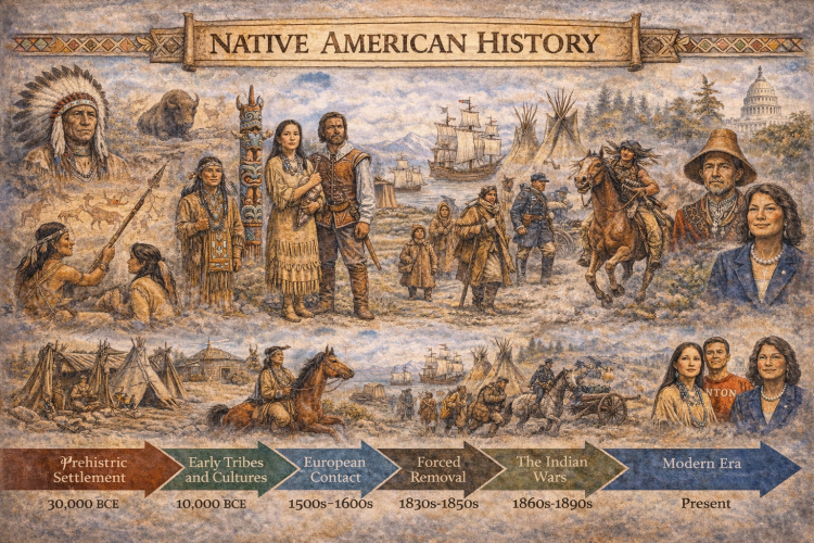 When Europeans arrived in North America, early interactions ranged from trade and cooperation to mistrust and violence. As colonial populations expanded, Native Americans faced land loss, broken treaties, and forced relocation.