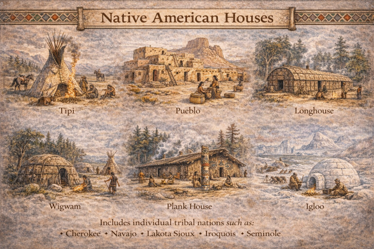 Native American tribes built homes using materials available in their local environments. These structures were designed for practicality, protection, and mobility.