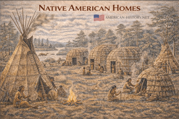 Housing varied depending on climate and lifestyle. Nomadic tribes used portable dwellings such as teepees, while settled tribes built permanent structures including longhouses and pueblos designed to house extended families or entire clans.