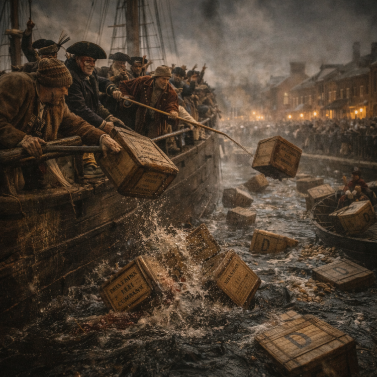 Colonists protest the Tea Act by dumping British tea into Boston Harbor.
