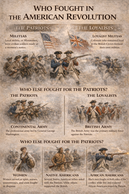 The war was primarily fought between the British army and the Americans. Americans did not have a proper army in 1775 and they mostly fought in the form of small militias.