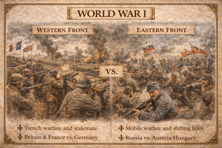 The Eastern Front was more fluid, involving Germany, Austria-Hungary, Russia, and later Romania. Unlike the West, it saw large territorial movements and fewer trenches.